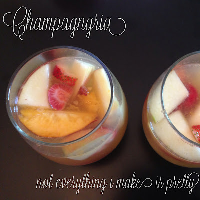 Last weekend I was working on a Save the Date for a friend’s wedding (side note: I’m a little in love with what we put together, I’ll post it here after she sends it out). Anyway, we decided to make a morning of it and came up with a recipe that combine the best part of mimosa’s with our happy hour drink of choice, sangria. And Champagngria was created! (Don’t worry, we edited and spell checked the Save the Date again later to make sure the bubbles didn’t go to our heads as we were working.)